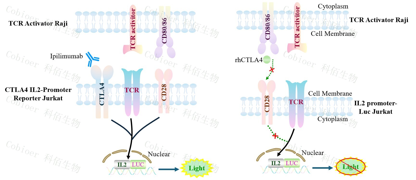 TCR Activator Raji 報告基因藥靶模型很好的模擬了體內(nèi) CD28&CD80/CD86 或者CTLA4 的信號轉(zhuǎn)導(dǎo)過程,原理見下圖所示。![]() Figure 1. TCR Activator Raji 細(xì)胞模型原理圖  |