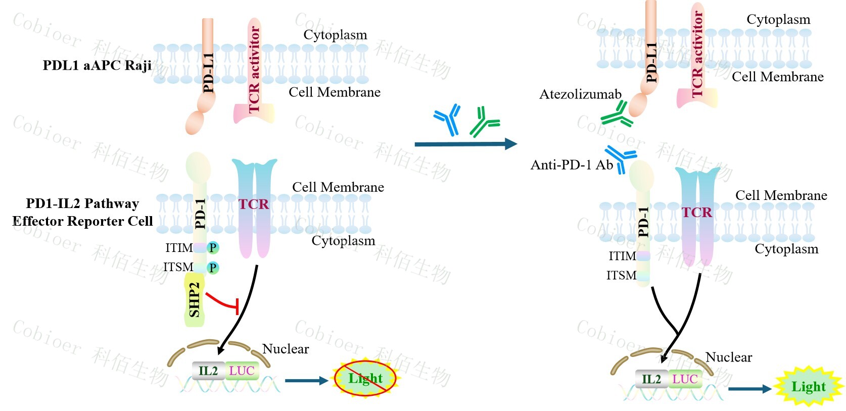 PD1-IL2 Pathway Effector Reporter Cell 報(bào)告基因藥靶模型很好的模擬了體內(nèi) PD1&IL2 的信號(hào)轉(zhuǎn)導(dǎo)過程,原理見下圖所示。![]() Figure 1. PD1-IL2 Pathway Effector Reporter Cell 細(xì)胞模型原理圖  |