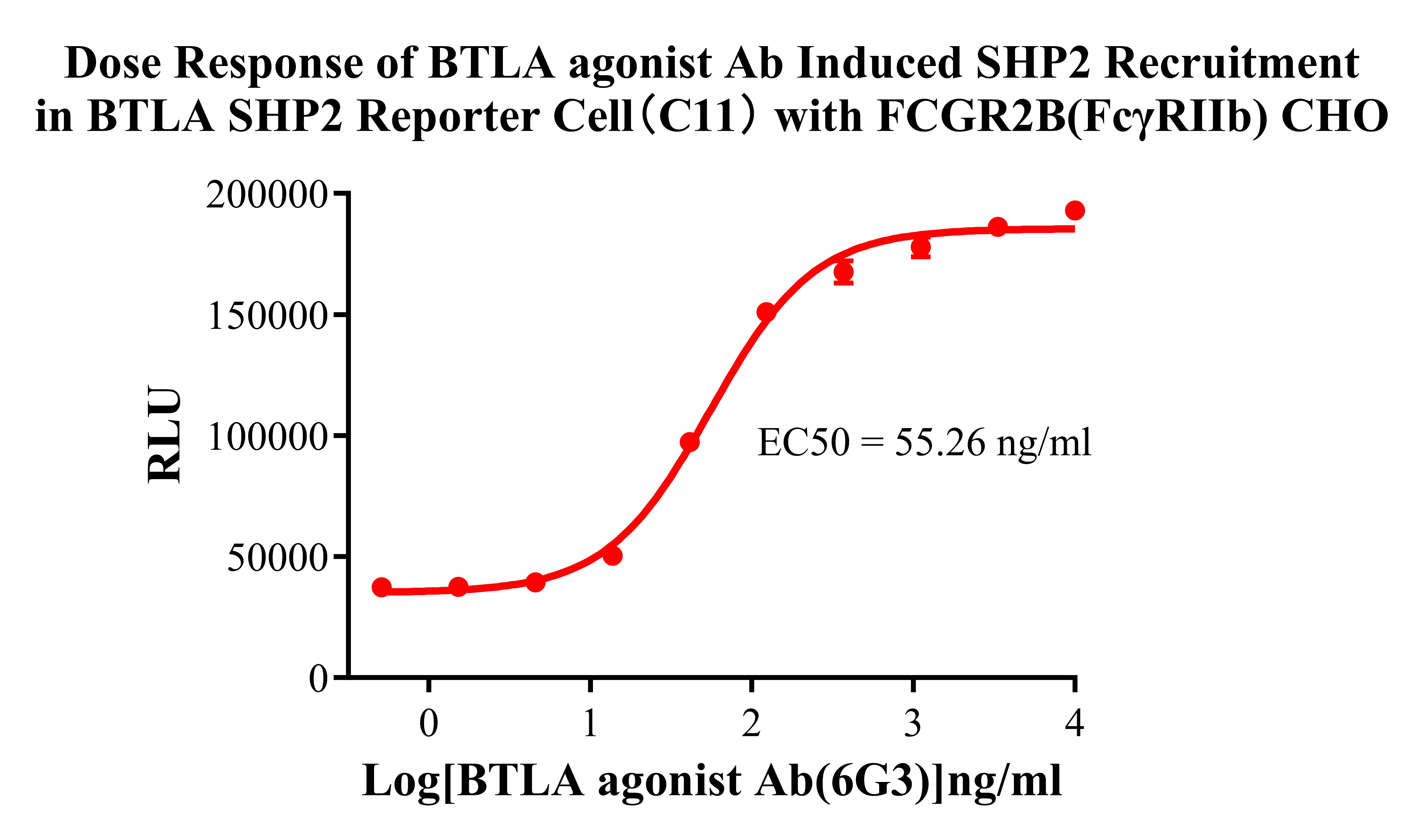 ![]() Figure 4. Dose Response of BTLA agonist Ab Induced SHP2 Recruitment in BTLA SHP2 Reporter Cell(C11) with FCGR2B(FcγRIIb) CHO. |