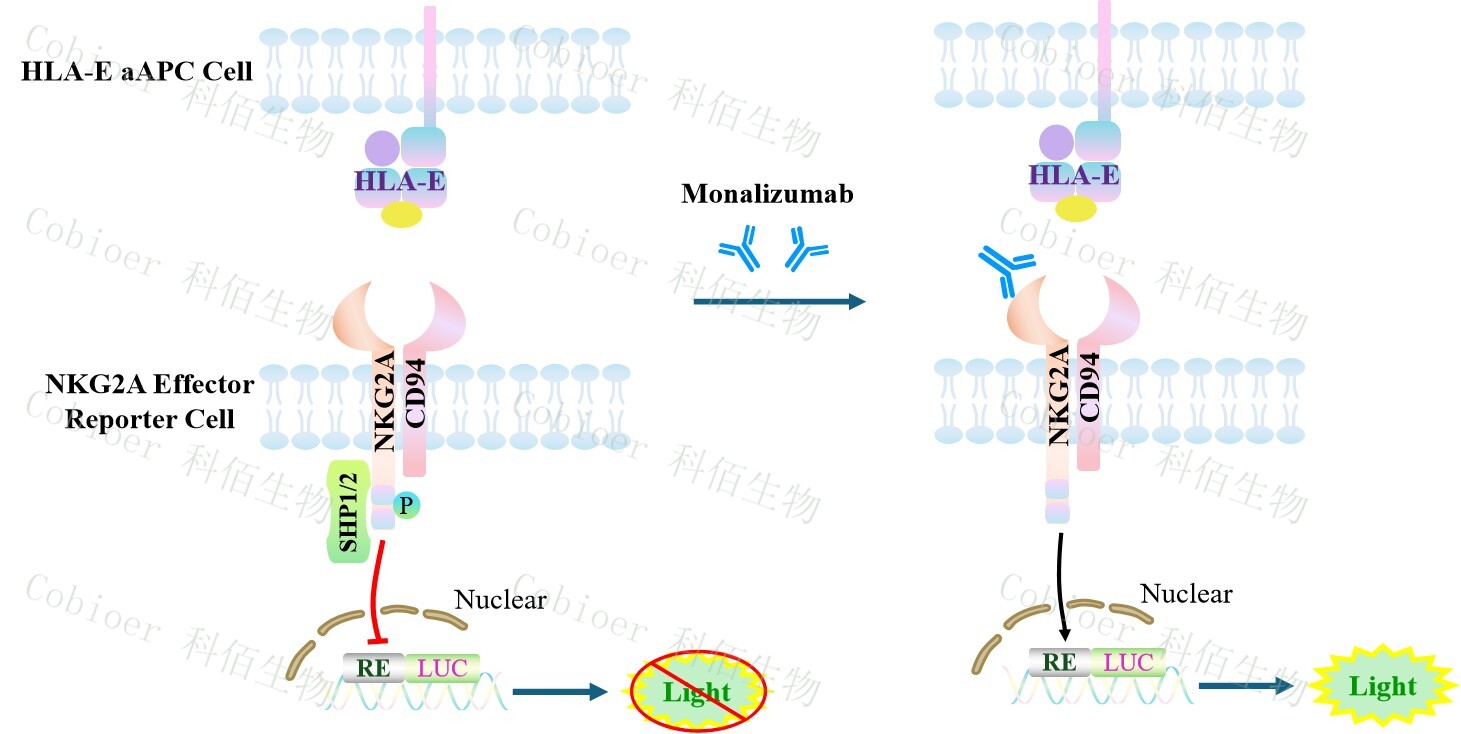 NKG2A Effector Reporter Cell 報(bào)告基因藥靶模型很好的模擬了體內(nèi) NKG2A 的信號(hào)轉(zhuǎn)導(dǎo)過(guò)程,原理見(jiàn)下圖所示。