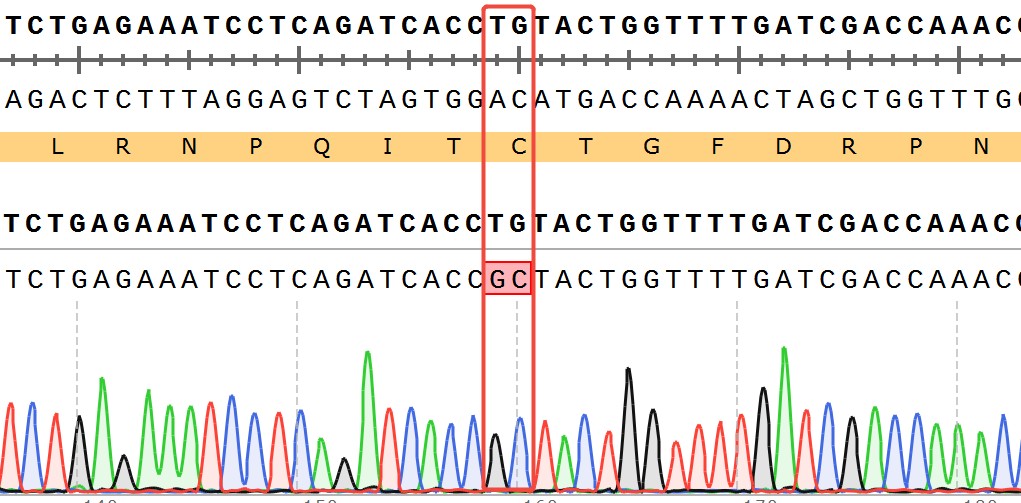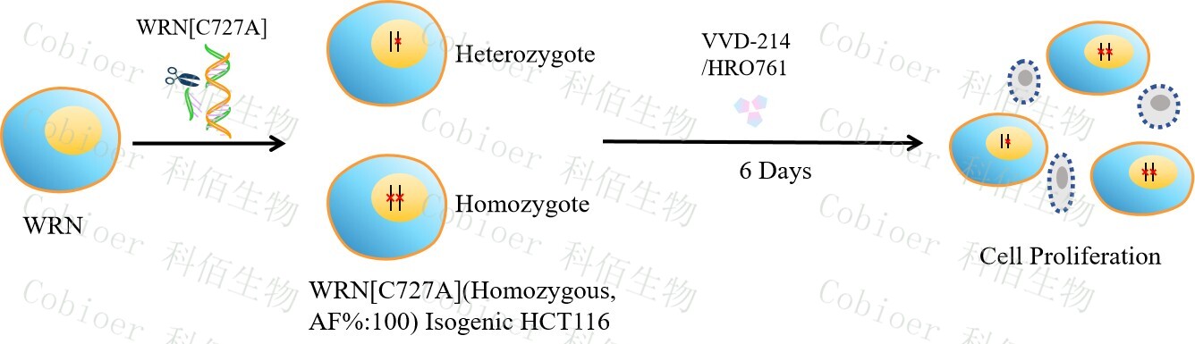 WRN[C727A](Homozygous,AF%:100) Isogenic HCT116 藥靶細胞,通過 基因編輯的方式將 WRN 的 727 位氨基酸胱氨酸(C)突變?yōu)楸彼幔ˋ)。![]() Figure 1. WRN[C727A](Homozygous,AF%:100) Isogenic HCT116 原理示意圖  |