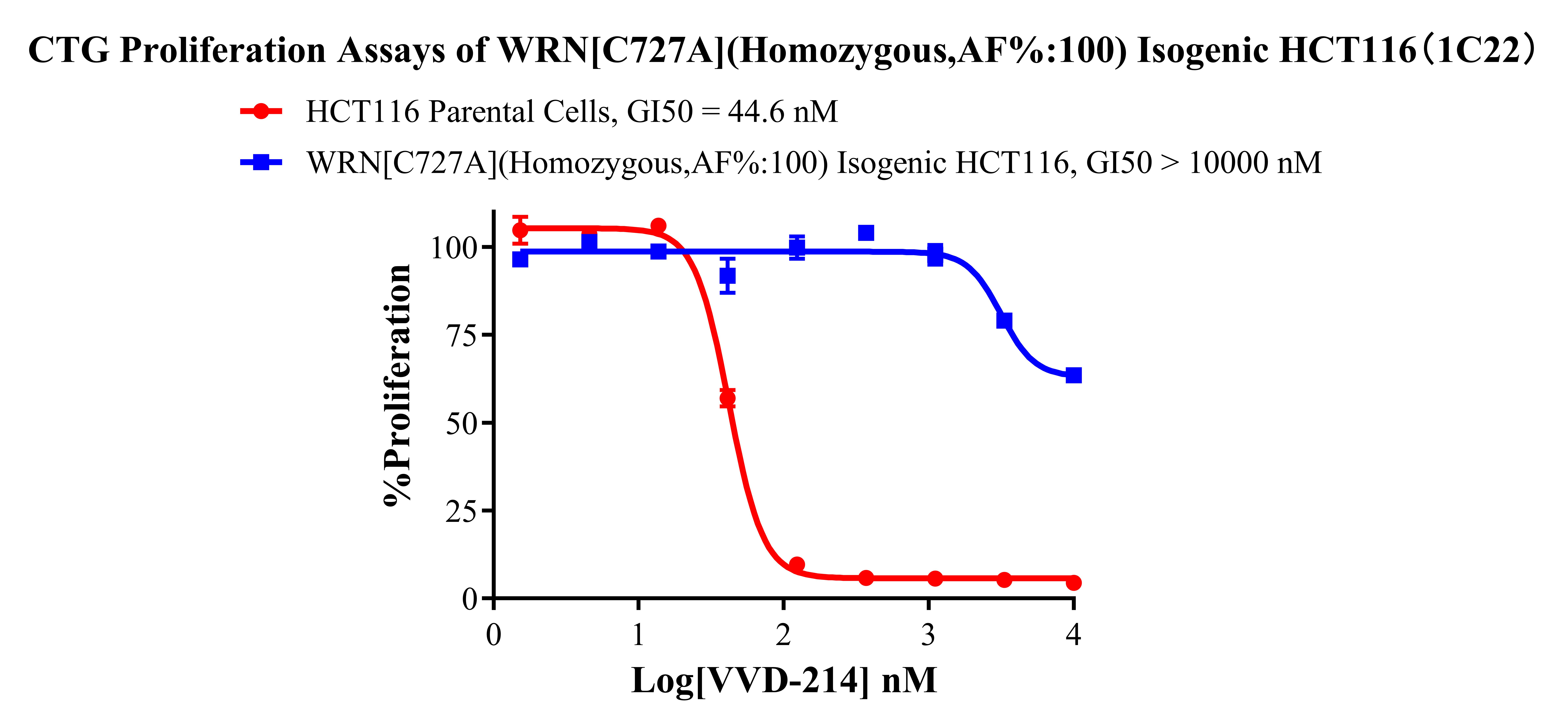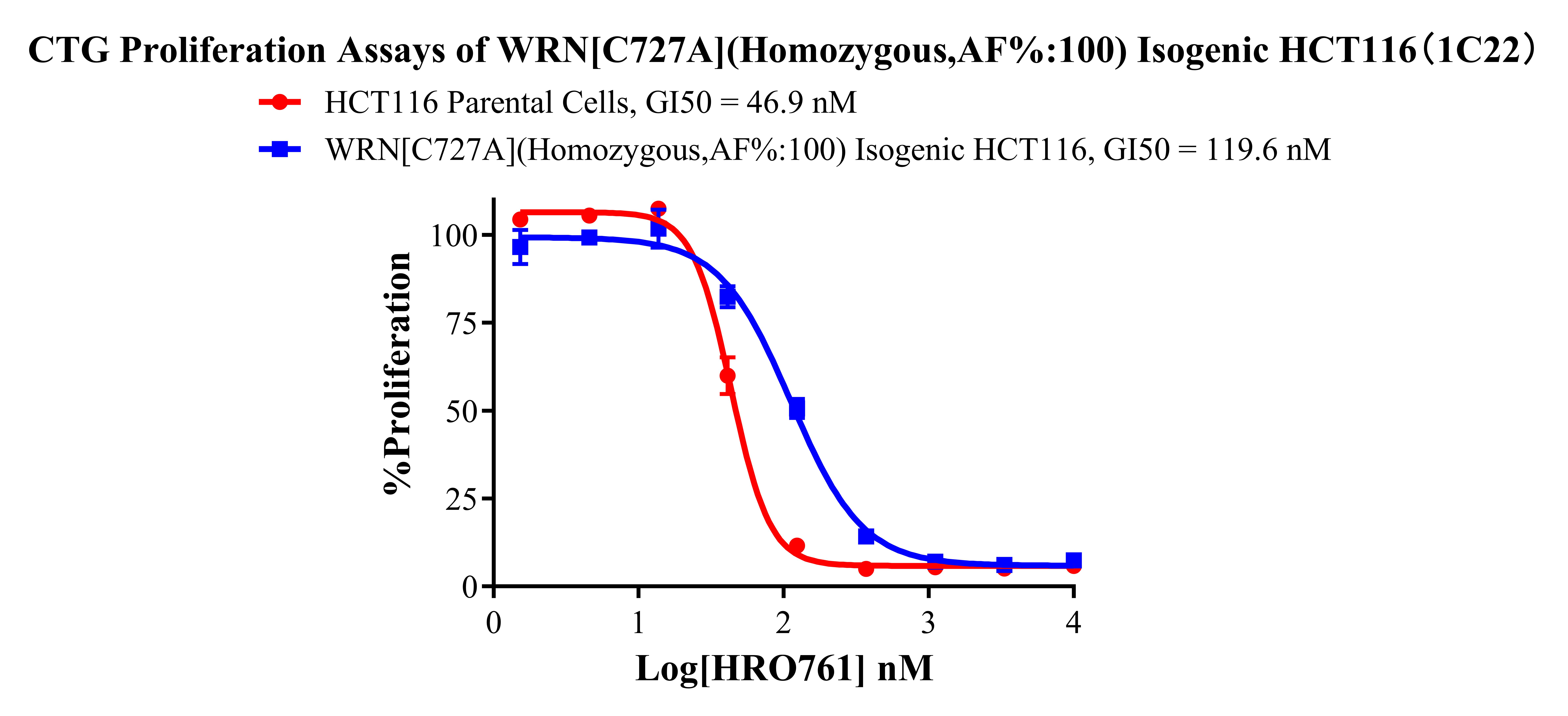 ![]() Figure 2. Sanger of WRN[C727A](Homozygous,AF%:100) Isogenic HCT116 ![]() Figure 3. A:HCT116 Parental Cell;B:WRN[C727A](Homozygous,AF%:100) Isogenic HCT116 通道2 藍色微滴代表WRN[C727A]突變陽性,通道2 綠色微滴代表該位點為陰性野生型 ![]() Figure 4. CTG Proliferation Assays of WRN[C727A](Homozygous,AF%:100) Isogenic HCT116(1C22). ![]() Figure 5. CTG Proliferation Assays of WRN[C727A](Homozygous,AF%:100) Isogenic HCT116(1C22).  |