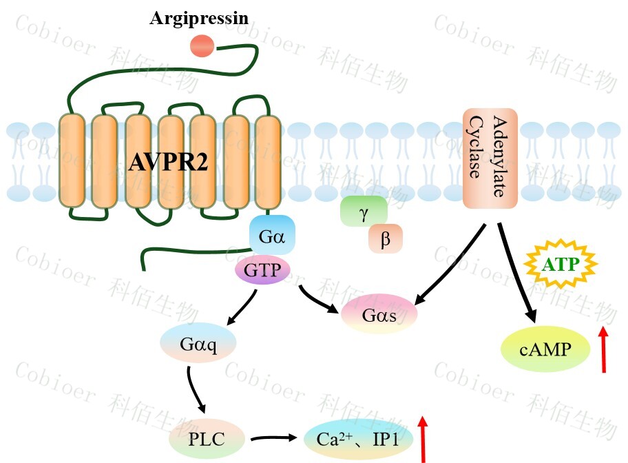 AVPR2(精氨酸加壓素受體 2 型)是一種主要分布于腎臟集合管上皮細(xì)胞基底側(cè)的 G 蛋白偶聯(lián)受體(GPCR),屬于加壓素/催產(chǎn)素受體家族,其特異性配體為垂體后葉分泌的 精氨酸加壓素(AVP,又稱抗利尿激素 ADH);該受體通過偶聯(lián) Gs 蛋白,激活腺苷酸環(huán) 化酶,升高 cAMP,激活蛋白激酶 A(PKA),最終磷酸化并促使水通道蛋白 AQP2 向細(xì) 胞膜轉(zhuǎn)位,從而增加水的重吸收、濃縮尿液并維持體液平衡;其功能缺陷是 X 連鎖隱性遺 傳性腎性尿崩癥(NDI) 的主要病因(占 90%),患者因基因突變導(dǎo)致受體失活,表現(xiàn)為 多尿、煩渴及低滲尿,而獲得性異常則與鋰中毒或梗阻性腎病相關(guān);此外,AVPR2 作為藥 物靶點(diǎn),其拮抗劑(如托伐普坦)已用于治療低鈉血癥和心力衰竭的體液潴留。  |