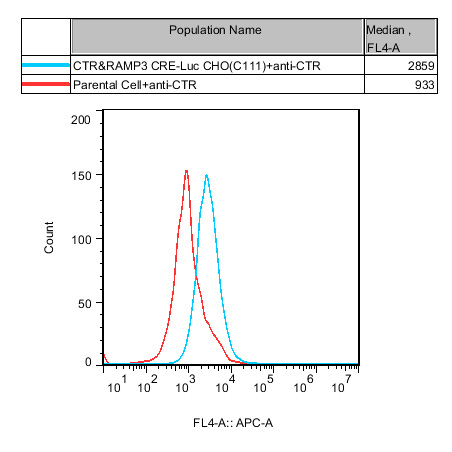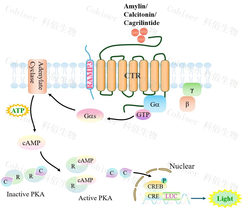 CTR&RAMP3 CRE-Luc CHO 報(bào)告基因藥靶模型很好的模擬了體內(nèi) CTR&RAMP3 的信 號(hào)轉(zhuǎn)導(dǎo)過程,原理見下圖所示。![]() Figure 1. CTR&RAMP3 CRE-Luc CHO 細(xì)胞模型原理圖  |