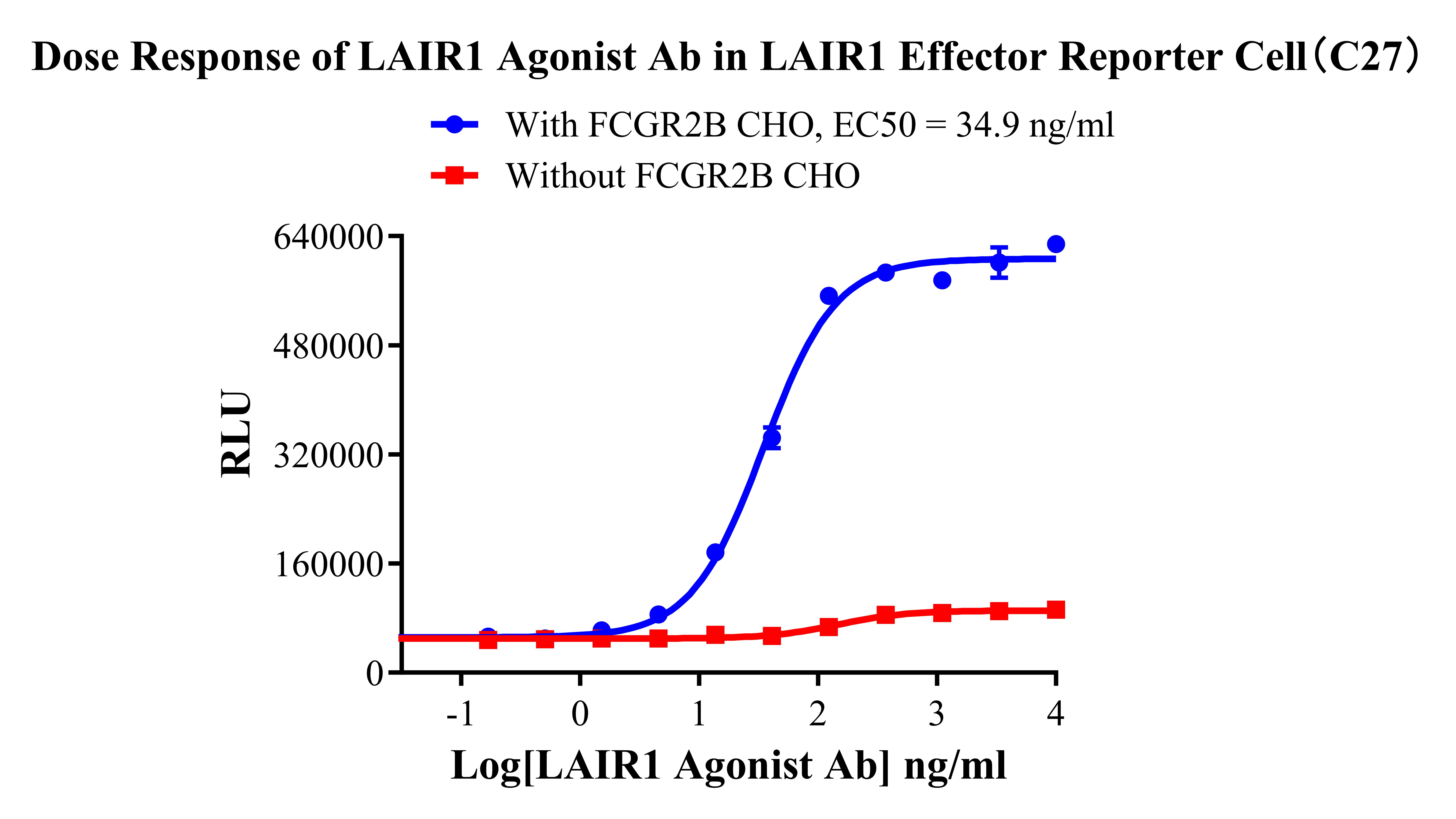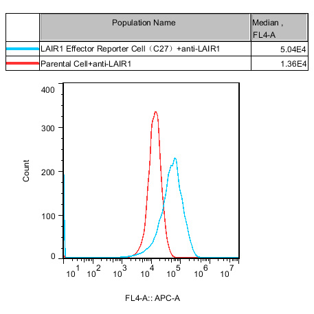 ![]() Figure 2. Recombinant LAIR1 Effector Reporter Cell stably expressing LAIR1. ![]() Figure 3. Dose Response of LAIRl Agonist Ab in LAIR1 Effector Reporter Cell(C27).  |
