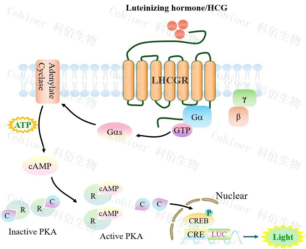 LHCGR CRE-Luc HEK293 報(bào)告基因藥靶模型很好的模擬了體內(nèi) LHCGR 的信號轉(zhuǎn)導(dǎo)過程,原理見下圖所示。![]() Figure 1. LHCGR CRE-Luc HEK293 細(xì)胞模型原理圖 |