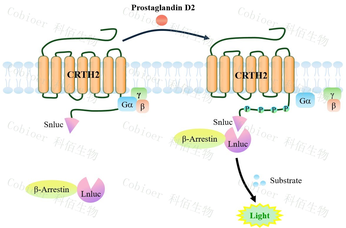 CRTH2(DP2) β-Arrestin CHO 報(bào)告基因藥靶模型很好的模擬了體內(nèi) CRTH2(DP2)/β- Arrestin 的信號(hào)轉(zhuǎn)導(dǎo)過程, 原理見下圖所示。 當(dāng)缺乏配體刺激時(shí) , β-Arrestin 不與 CRTH2(DP2)結(jié)合,融合β-Arrestin 的熒光素酶處于失活構(gòu)象,當(dāng) CRTH2(DP2)遭遇配體刺 激時(shí),融合熒光素酶報(bào)告基因的β-Arrestin 被招募,使熒光素酶報(bào)告基因處于激活狀態(tài),加 入其底物后發(fā)光信號(hào)增強(qiáng)。![]() Figure 1. CRTH2(DP2) β-Arrestin CHO 細(xì)胞模型原理圖  |