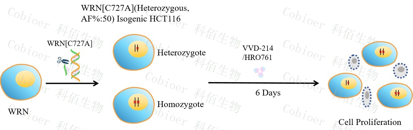 WRN[C727A](Heterozygous,AF%:50) Isogenic HCT116 藥靶細胞,通過基 因編輯的方式將 WRN 的 727 位氨基酸胱氨酸(C)突變?yōu)楸彼幔ˋ)。![]() Figure 1. WRN[C727A](Heterozygous,AF%:50) Isogenic HCT116 原理示意圖  |