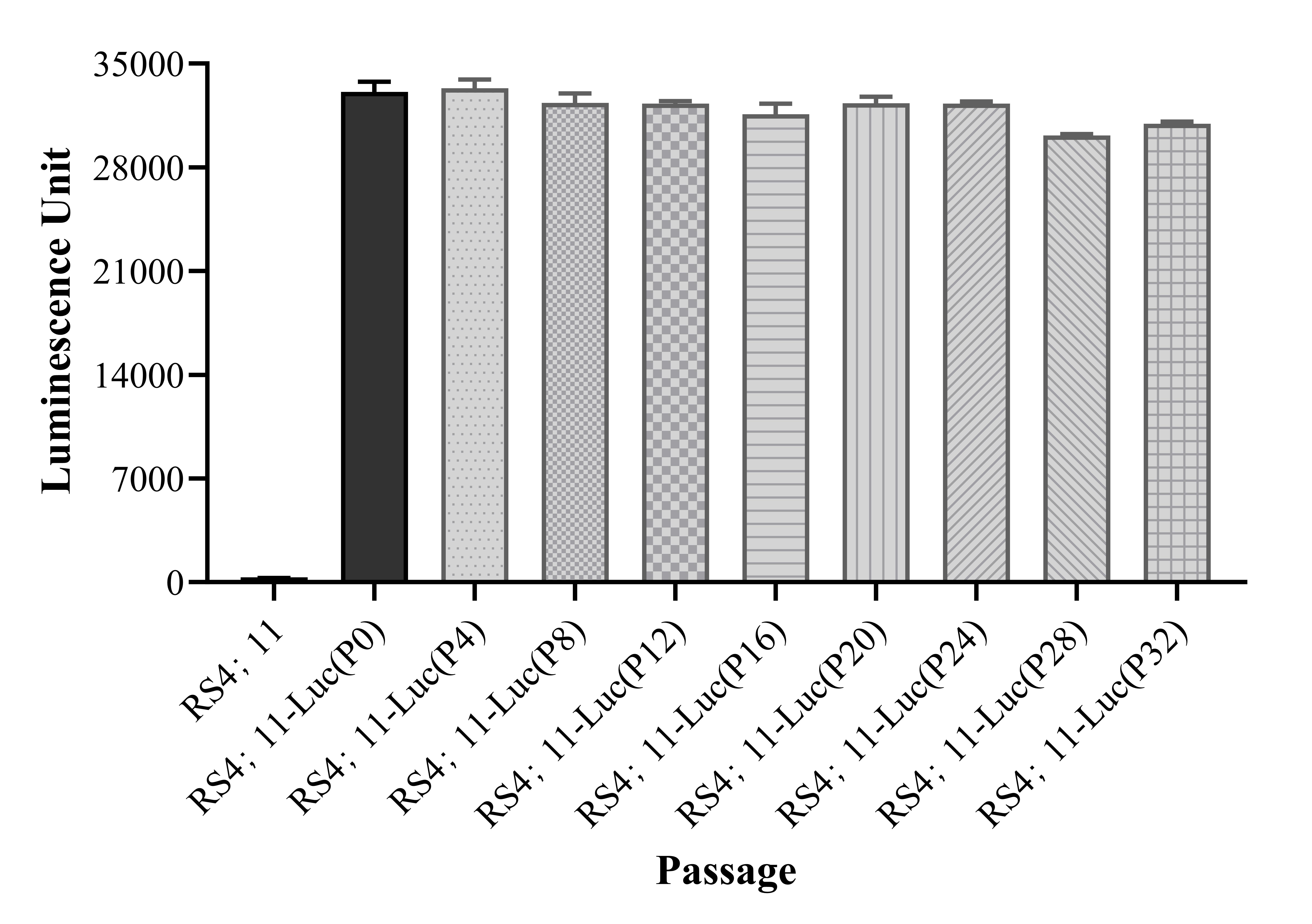 Figure 1. Stablity test results. RS4;11-Luc showed at least 32 passage stability with similar luminescence unit.  |