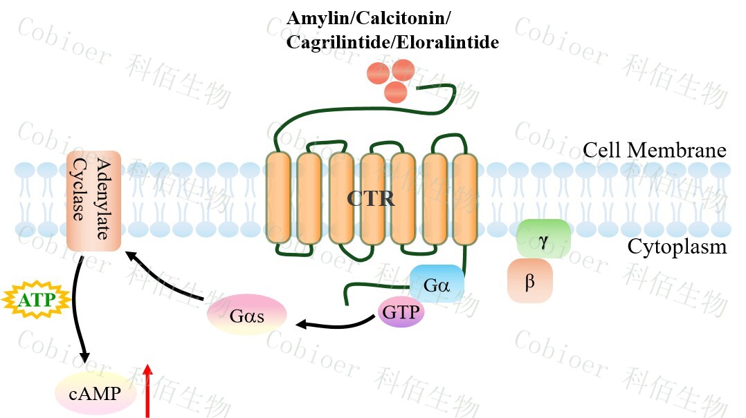 |      降鈣素基因相關(guān)肽(CGRP)家族包括 CGRP 本身、降鈣素(CT)、腎上腺髓質(zhì)素 (AM)和胰島淀粉樣肽(AMY)。 胰淀素(Amylin)受體的三種類型的已被確定,即 AMY1,AMY2 和 AMY3。胰淀素 受體屬于 B 類 GPCR,是異二聚體復合物,由降鈣素受體(CTR)與受體活性修飾蛋白 (RAMPs)結(jié)合形成。該受體的 CTR 組分具有相同的 GPCR 結(jié)構(gòu):7 個跨膜相互連接的α- 螺旋,將細胞外信號傳遞到細胞內(nèi)細胞質(zhì)信號級聯(lián)。RAMP 有三種類型(RAMP1、 RAMP2 和 RAMP3),它們共享 31%的氨基酸序列,具有相似的基本結(jié)構(gòu)。RAMP 是將 CTR 轉(zhuǎn)運到細胞膜并調(diào)節(jié)其配體特異性的重要肽,它可以改變特定 GPCR 的藥理學、功能 和細胞運輸。 哺乳動物細胞中 Amylin 受體的激活已被證明可以提高 cAMP,并被認為與 Gs 蛋白和 腺苷酸環(huán)化酶的刺激有關(guān)。在 RAMPs 的存在下,其與胰淀素的結(jié)合親和力可以被修飾。 CTR 和 RAMP1 或 CTR 和 RAMP3 的異質(zhì)結(jié)構(gòu)被認為有利于與胰淀素結(jié)合,介導大腦中的 生理功能。AMY3 的激活刺激 G 蛋白 Gαs,進一步控制腺苷酸環(huán)化酶(AC),隨后增加細 胞 cAMP。cAMP 與 PKA 調(diào)控亞基(R2)的結(jié)合誘導 PKA 四聚體全酶解離,導致 PKA 催 化亞基的激活。cAMP 激活的 PKA 參與調(diào)控 ERK1/2 的活性。ERK1/2 通路的觸發(fā)可能導致 Ca 2+分布不均勻,引發(fā)內(nèi)質(zhì)網(wǎng)和線粒體功能障礙,導致細胞死亡。此外,cAMP 刺激 AKT 進一步導致轉(zhuǎn)錄因子 cFos 的表達。  |
