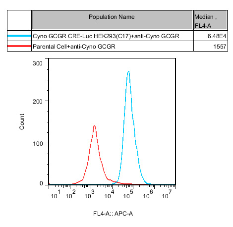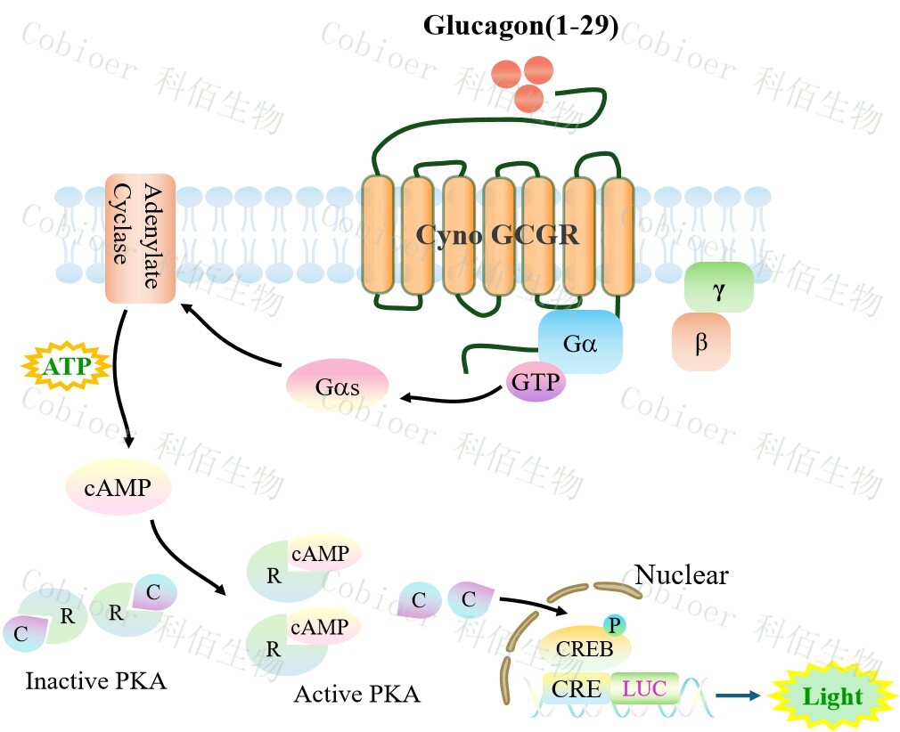 Cyno GCGR CRE-Luc HEK293 報(bào)告基因藥靶模型很好的模擬了體內(nèi) GCGR 的信號(hào)轉(zhuǎn)導(dǎo)過程,原理見下圖所示。