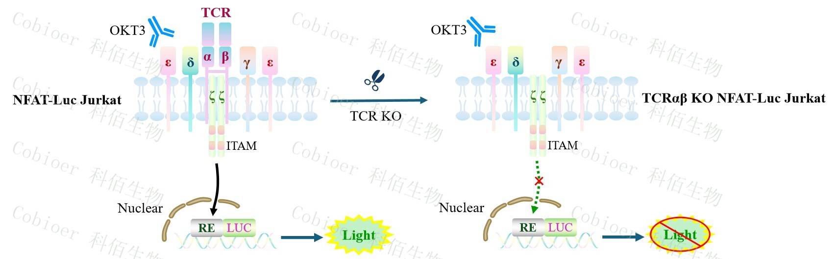 TCRαβ KO NFAT-Luc Jurkat 報(bào)告基因藥靶模型很好的模擬了體內(nèi) TCR 的信號(hào)轉(zhuǎn)導(dǎo)過(guò)程, 原理見(jiàn)下圖所示。![]() Figure 1. TCRαβ KO NFAT-Luc Jurkat 細(xì)胞模型原理圖  |