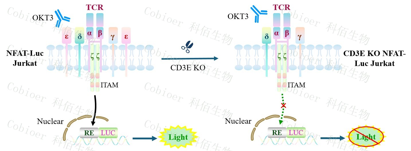 CD3E KO NFAT-Luc Jurkat 報告基因藥靶模型很好的模擬了體內 TCR 的信號轉導過程, 原理見下圖所示。![]() Figure 1. CD3E KO NFAT-Luc Jurkat 細胞模型原理圖  |