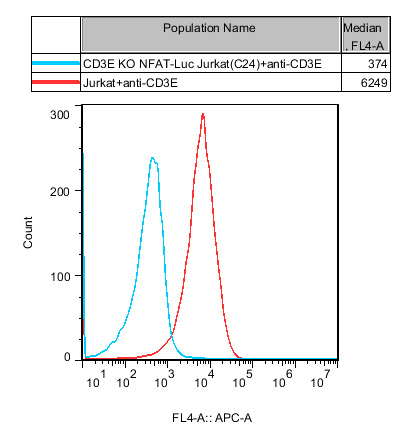 ![]() Figure 2. CD3E(NM_000733.4):c.397_398ins4bp/CD3E:p.I133Kfs ![]() Figure 3. Recombinant CD3E KO NFAT-Luc Jurkat stably expressing CD3E. ![]() Figure 4. Dose Response of CD3 Agonist Antibody in CD3E KO NFAT-Luc Jurkat (2C24)