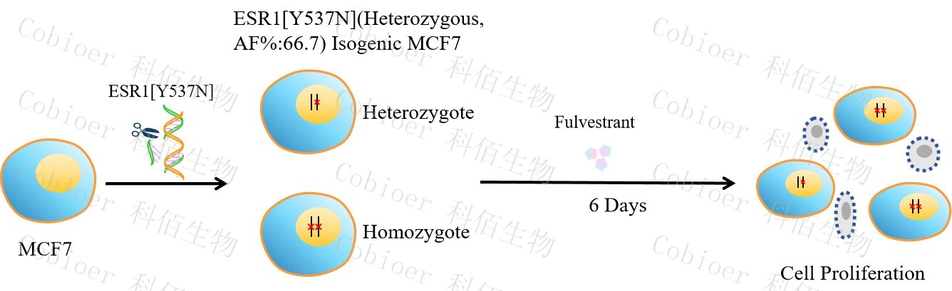 ESR1[Y537N](Heterozygous,AF%66.7) Isogenic MCF7 藥靶細(xì)胞,通過(guò)基 因編輯的方式將 ESR1 的 537 位氨基酸酪氨酸(Y)突變?yōu)樘於0罚∟)。![]() Figure 1. ESR1[Y537N](Heterozygous,AF%66.7) Isogenic MCF7 原理示意圖  |