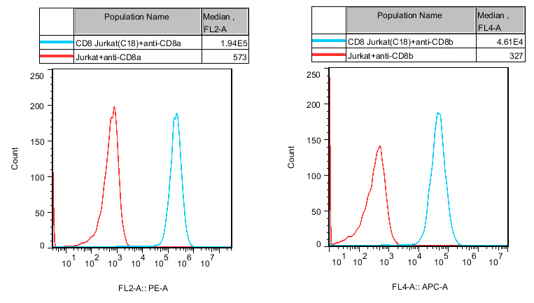 ![]() Figure 1. Recombinant CD8 Jurkat stably expressing CD8a & CD8b.