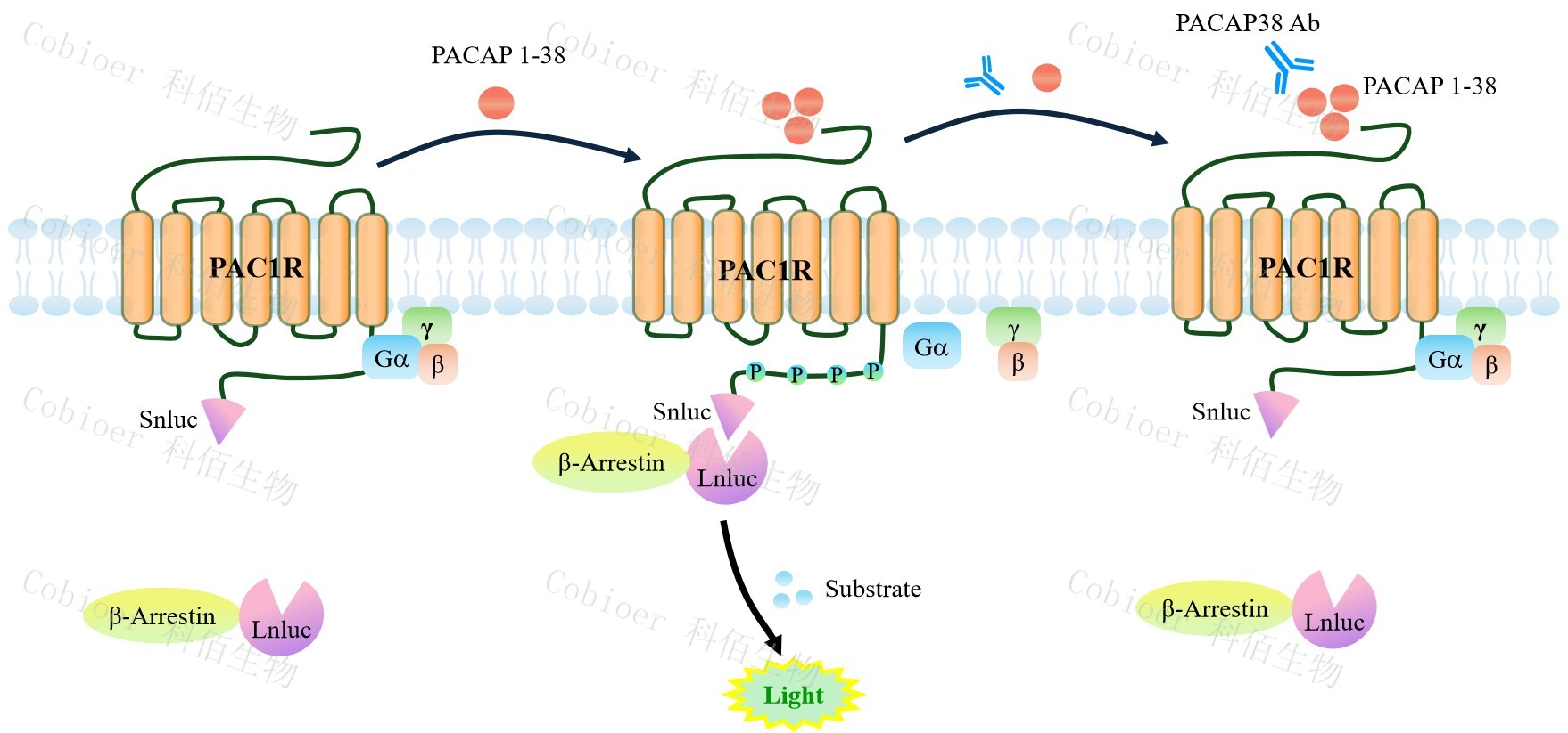 PAC1R β-Arrestin CHO 報告基因藥靶模型很好的模擬了體內(nèi) PAC1R/β-Arrestin 的信號轉(zhuǎn)導(dǎo)過程,原理見下圖所示。當(dāng)缺乏配體刺激時,β-Arrestin 不與 PAC1R 結(jié)合,融合β- Arrestin 的熒光素酶處于失活構(gòu)象,當(dāng) PAC1R 遭遇配體刺激時,融合熒光素酶報告基因的 β-Arrestin 被招募,使熒光素酶報告基因處于激活狀態(tài),加入其底物后發(fā)光信號增強。![]() Figure 1. PAC1R β-Arrestin CHO 細(xì)胞模型原理圖  |