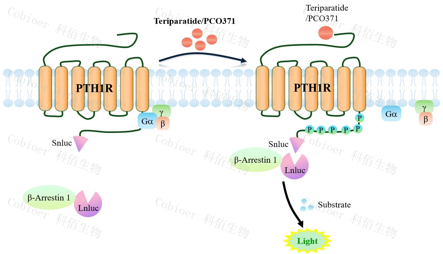 PTH1R β-Arrestin 1 CHO 報告基因藥靶模型很好的模擬了體內(nèi) PTH1R/β-Arrestin 1 的信號轉(zhuǎn)導(dǎo)過程,原理見下圖所示。當(dāng)缺乏配體刺激時,β-Arrestin 1 不與 PTH1R 結(jié)合,融合β- Arrestin 1 的熒光素酶處于失活構(gòu)象,當(dāng) PTH1R 遭遇配體刺激時,融合熒光素酶報告基因 的β-Arrestin 1 被招募,使熒光素酶報告基因處于激活狀態(tài),加入其底物后發(fā)光信號增強(qiáng)。![]() Figure 1. PTH1R β-Arrestin 1 CHO 細(xì)胞模型原理圖  |