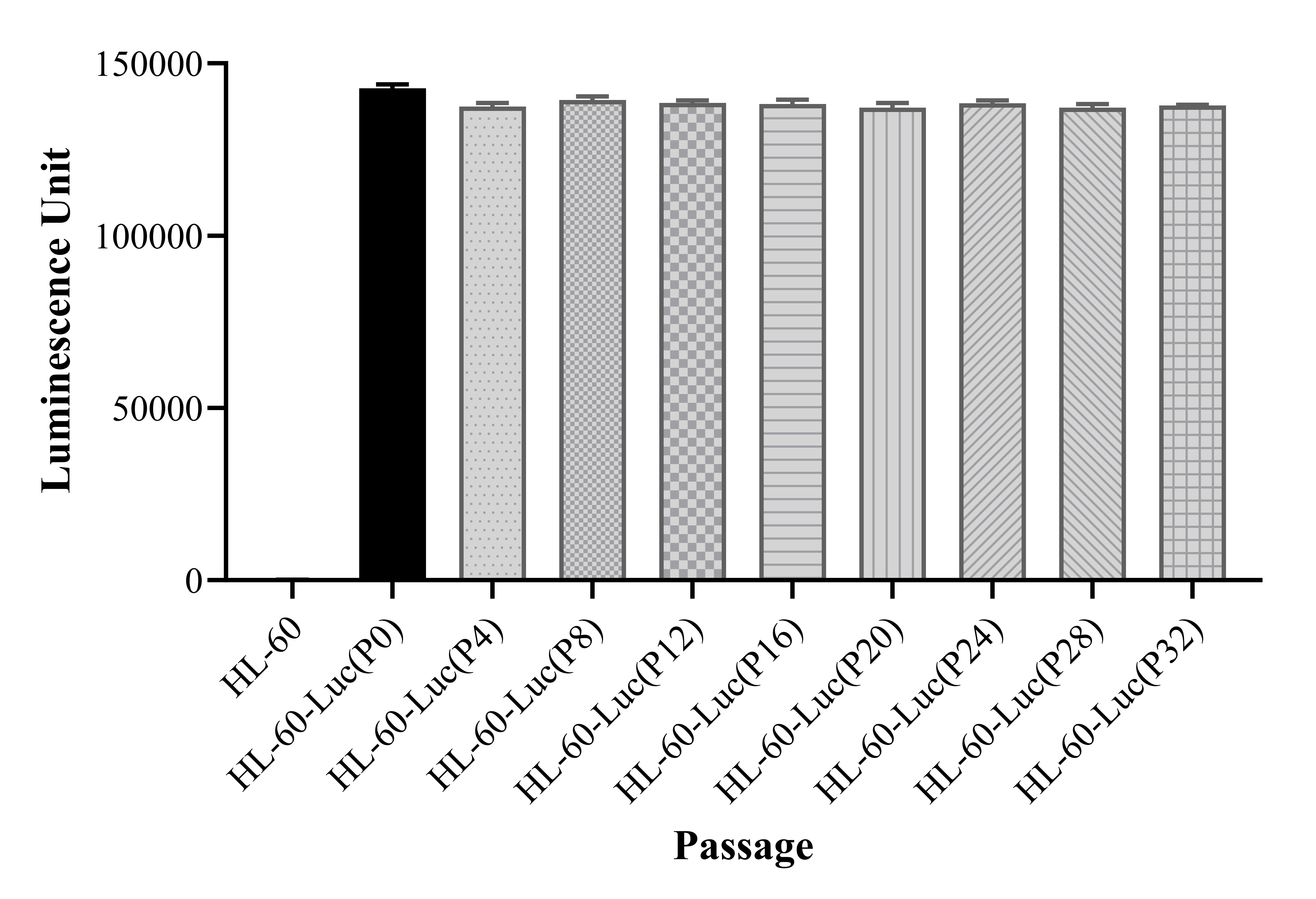 Figure 1. Stablity test results. HL-60-Luc showed at least 32 passage stability with similar luminescence unit.
