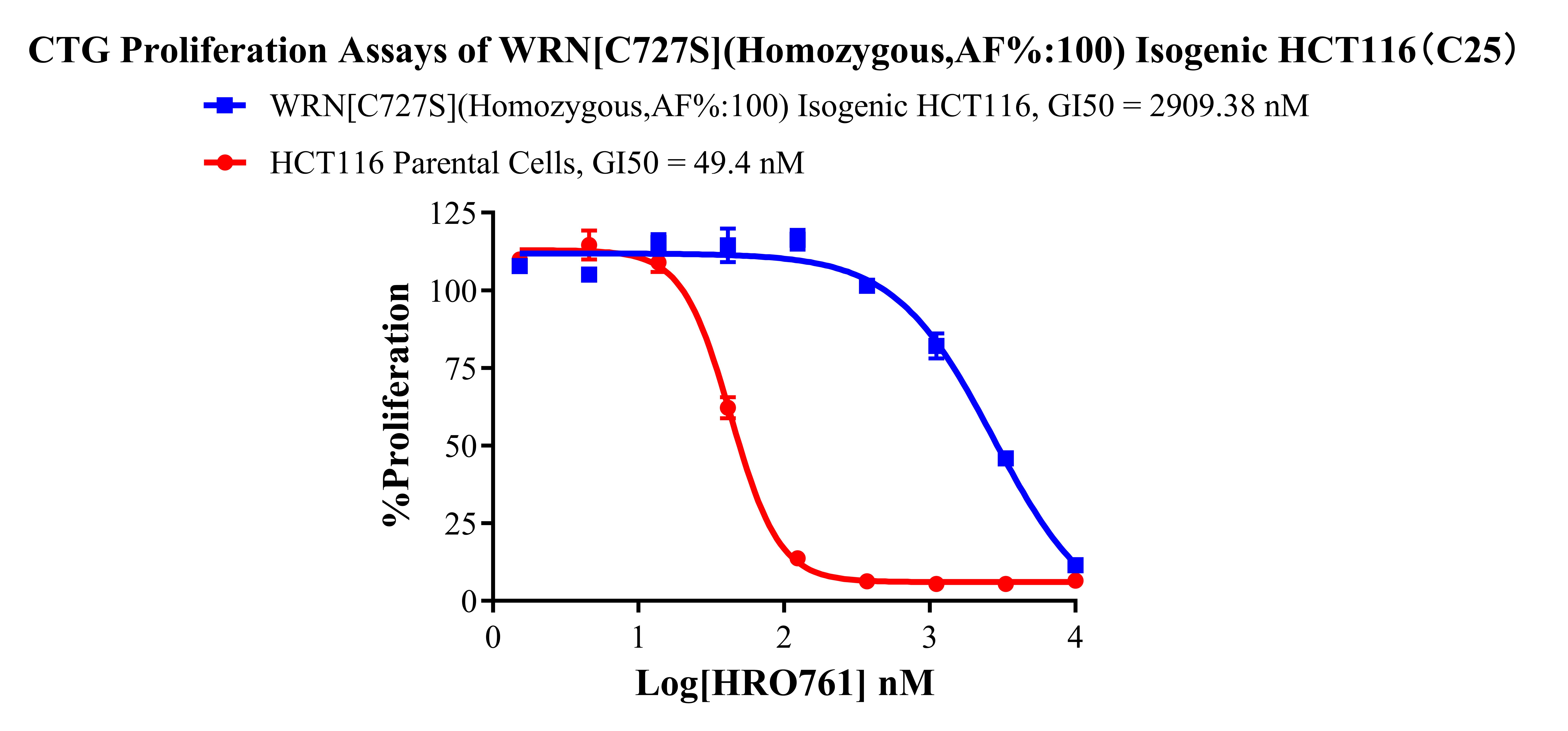WRN[C727S](Homozygous,AF%:100) Isogenic HCT116 藥靶細胞,通過基因編輯的方式將 WRN 的 727 位氨基酸胱氨酸(C)突變?yōu)榻z氨酸(S)。![]() Figure 1. WRN[C727S](Homozygous,AF%:100) Isogenic HCT116 原理示意圖 |