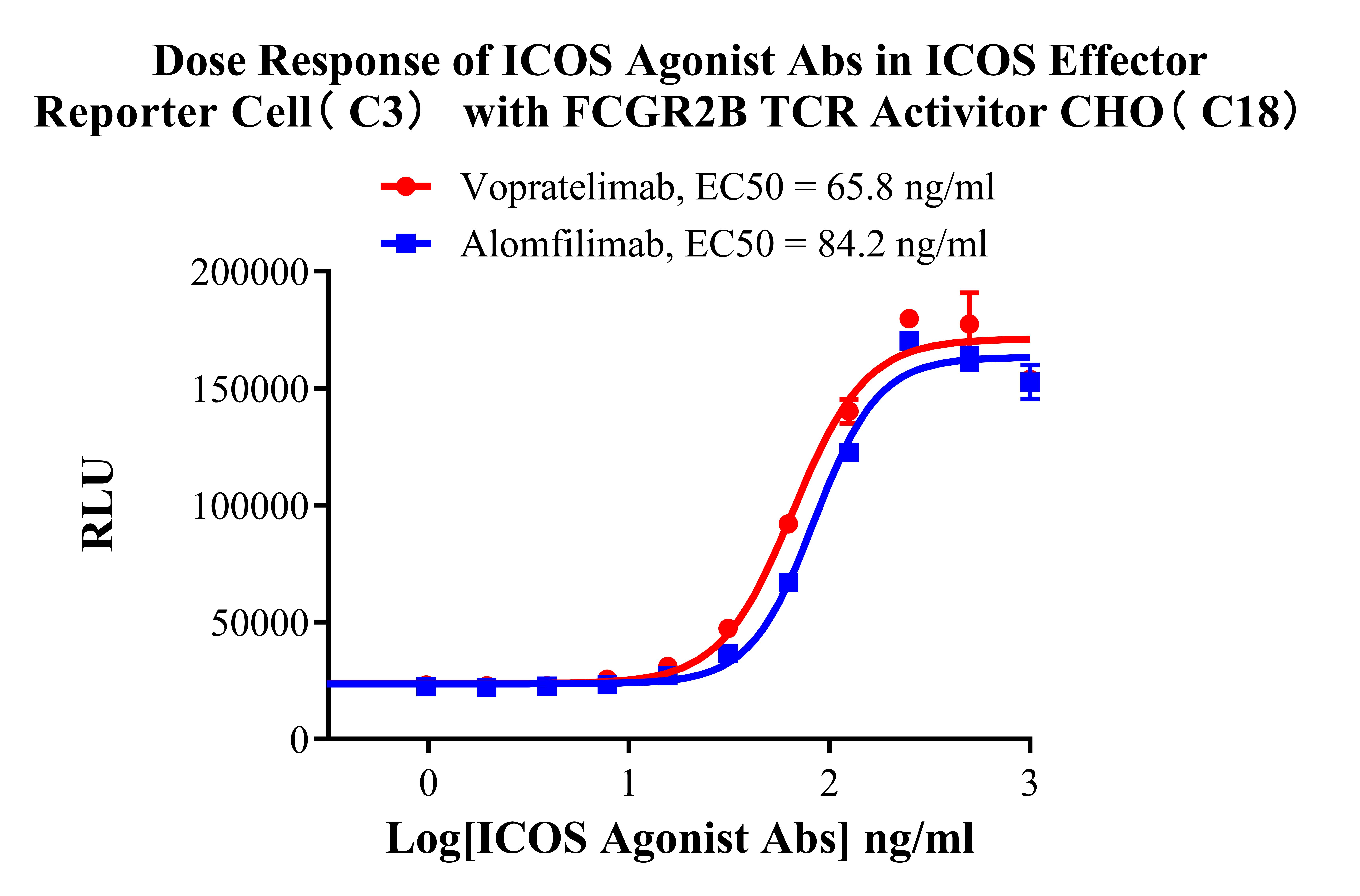 ![]() Figure 1. Recombinant ICOSL aAPC CHO stably expressing ICOSL. ![]() Figure 2. Dose Response of ICOS Agonist Abs in ICOS Effector Reporter Cell(C3) with FCGR2B TCR Activitor CHO(C18).