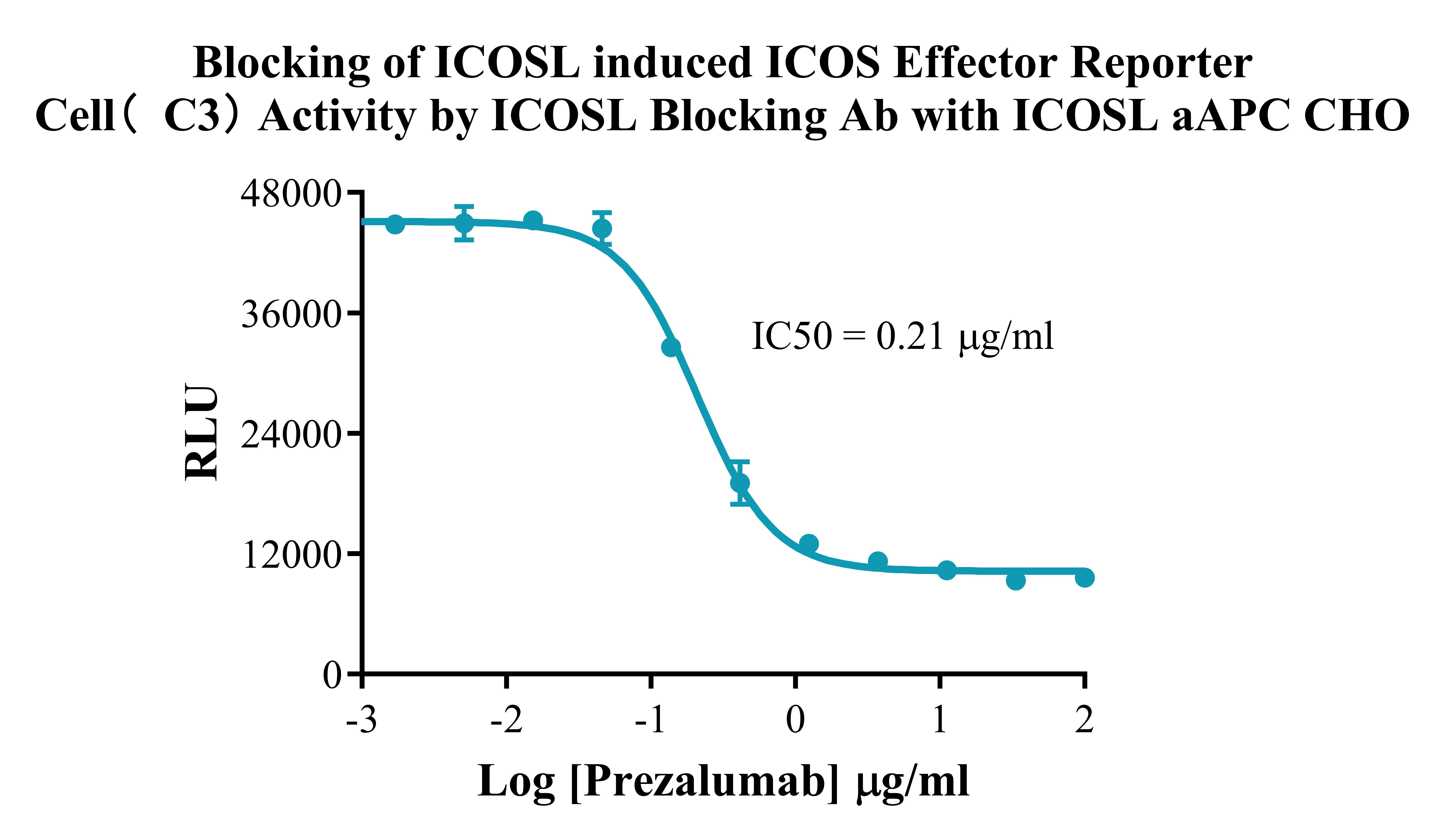 ![]() Figure 3. Blocking of ICOSL induced ICOS Effector Reporter Cell(C3) Activity by ICOSL Blocking Ab with ICOSL aAPC CHO. |