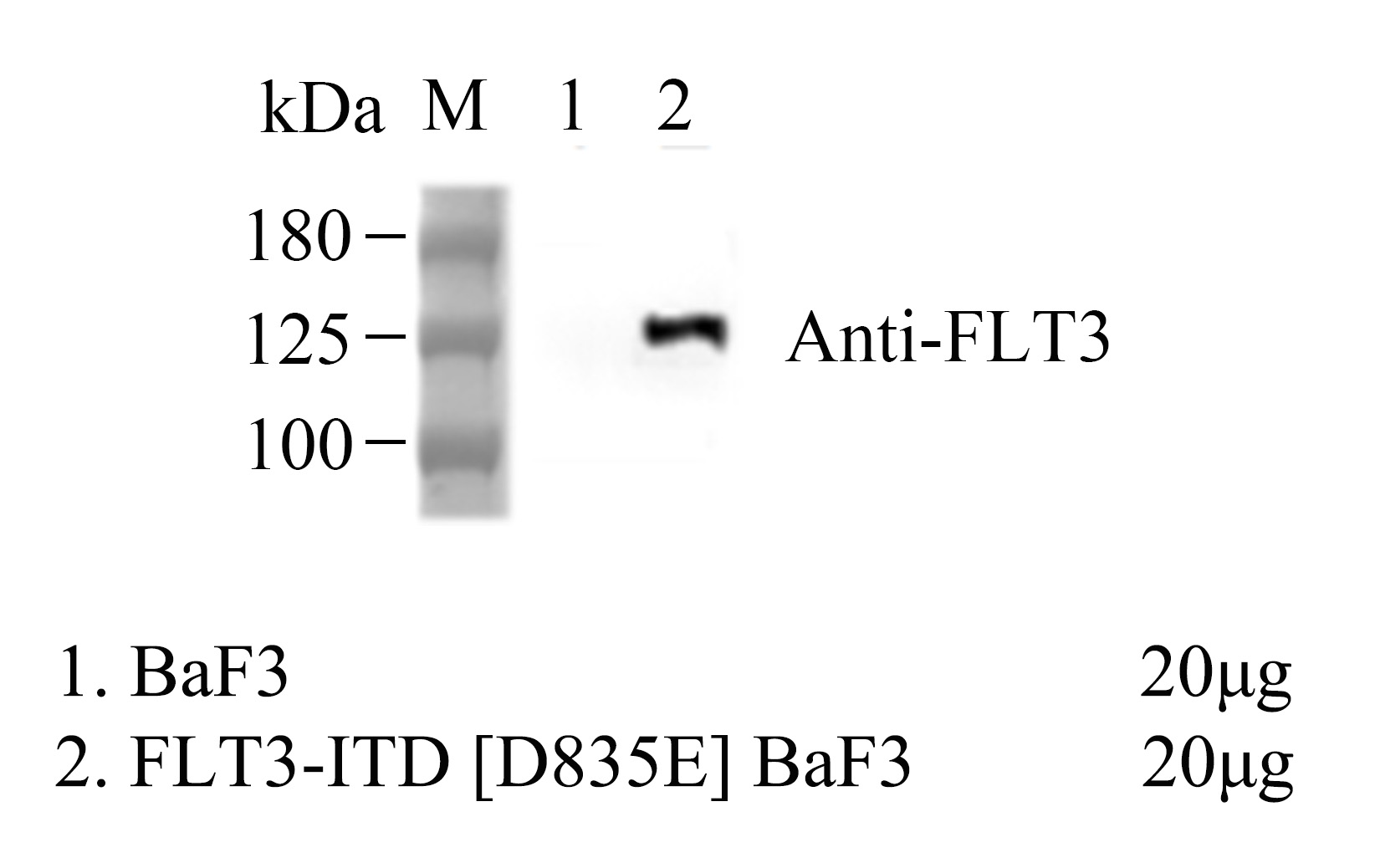 FLT3, receptor-type tyrosine-protein kinase FLT3, activates Akt, Ras, and Erk pathways to regulate differentiation, proliferation, and survival of hematopoietic progenitor cells (PMID: 29316714, PMID: 28538663). Activating mutations of FLT3 are common in hematologic tumors (PMID: 19467916) and the internal tandem duplication (ITD) mutation is commonly observed in acute myeloid leukemia (PMID: 30181385). |