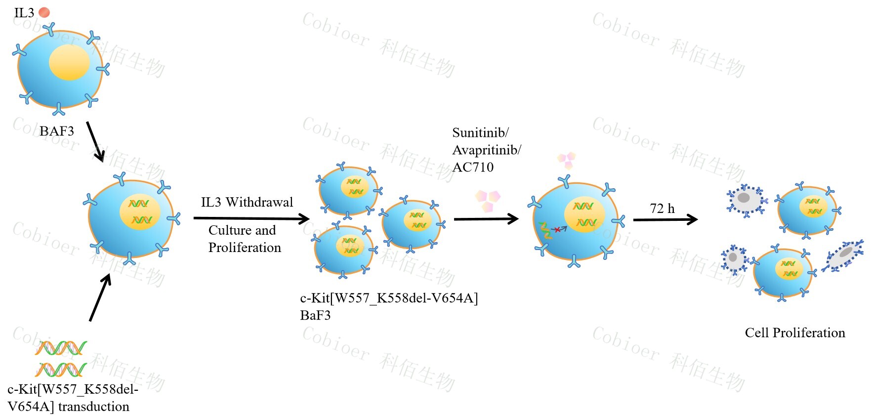 | c-Kit[W557_K558del-V654A] BaF3 藥靶細(xì)胞,通過轉(zhuǎn)導(dǎo)突變狀態(tài)的 c- Kit[W557_K558del-V654A] 基 因 到 BaF3 細(xì) 胞 系 中 , 穩(wěn) 定 表 達(dá) 人突變形態(tài)下的 c- Kit[W557_K558del-V654A] 基因。 BaF3(小鼠原 B 細(xì)胞)的生長(zhǎng)和增殖需要 IL-3 的維持。通過引入各種表達(dá)激酶的基因, 能作為 BaF3 的驅(qū)動(dòng)基因,讓 BaF3 不再依賴 IL-3 而增殖,進(jìn)而激酶基因成為 BaF3 增殖依 賴的驅(qū)動(dòng)基因,用于評(píng)估小分子藥物對(duì)激酶的靶向抑制作用,原理及流程見下圖所示。 ![]() Figure 1. c-Kit[W557_K558del-V654A] BaF3 細(xì)胞的構(gòu)建原理圖 |