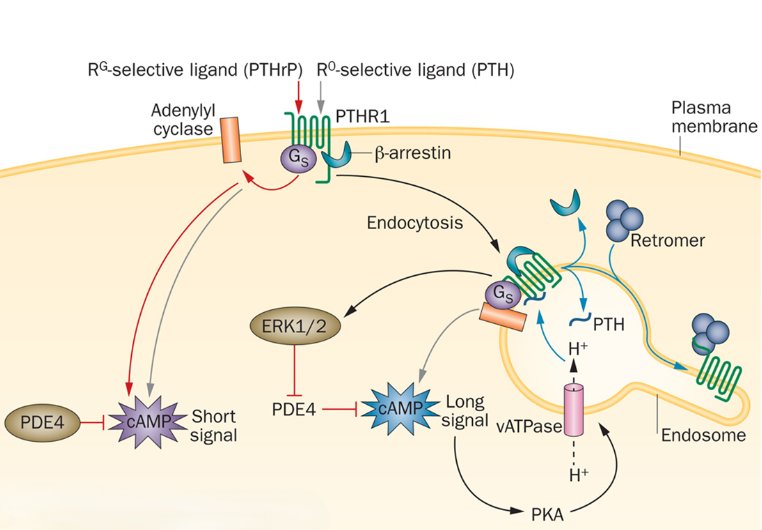PTH1R與β-arrestin(特別是β-arrestin-1)結(jié)合后,可激活ERK-1/2/MAPK通路,延長(zhǎng)cAMP信號(hào)的持續(xù)時(shí)間,并促進(jìn)細(xì)胞外信號(hào)響應(yīng)。內(nèi)體信號(hào)傳導(dǎo)的終止與逆轉(zhuǎn)錄聚體分選蛋白的 β-抑制素復(fù)合物交換相關(guān),并受到 vATP 酶介導(dǎo)的囊泡酸化的促進(jìn)。vATP酶被cAMP依賴性PKA激活,從而建立負(fù)反饋回路。PTH1R 激活細(xì)胞內(nèi)持續(xù)時(shí)間和起源位置不同的 cAMP 信號(hào)傳導(dǎo)為配體定向的細(xì)胞反應(yīng)多樣化提供了潛在機(jī)制。這一通路既可通過G蛋白依賴途徑,也可通過G蛋白非依賴的β-arrestin直接激活。值得注意的是,β-arrestin依賴性信號(hào)在骨代謝中具有獨(dú)特作用,例如通過β-arrestin介導(dǎo)的ERK激活,促進(jìn)成骨細(xì)胞合成代謝,且不刺激骨吸收,對(duì)于骨的合成代謝發(fā)揮獨(dú)特的生理功能。