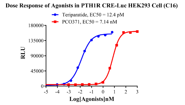 Figure 4.通過Ultra熒光素酶檢測(cè)試劑盒CBPH0001檢測(cè)熒光素酶測(cè)定激動(dòng)劑在 PTH1R CRE-Luc HEK293 (C16) 中的劑量反應(yīng)。