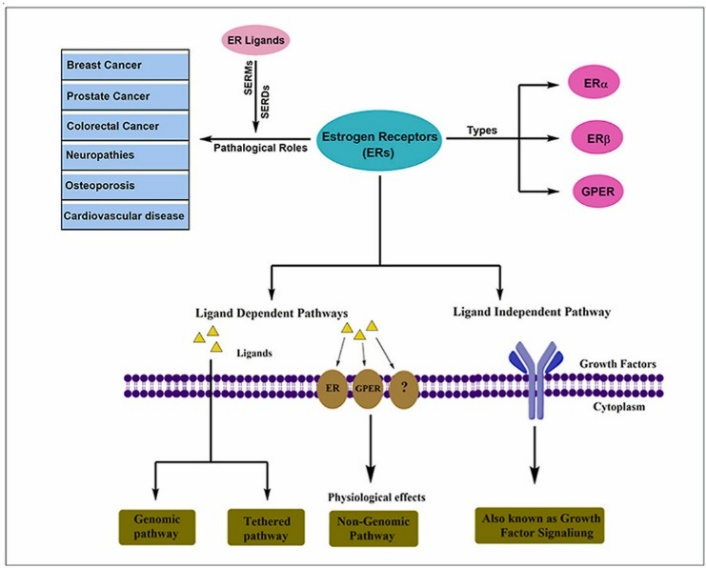 在過去的幾十年中,ER在前列腺癌、結(jié)腸直腸癌和乳腺癌等各種癌癥中的作用已被深入研究。研究表明,雌激素受體不僅會(huì)介導(dǎo)乳腺癌的發(fā)生,而且在許多其他的人類病理(如心血管疾病、骨質(zhì)疏松癥和肥胖、阿爾茲海默癥、自身免疫性甲狀腺疾?。┲邪l(fā)揮作用。