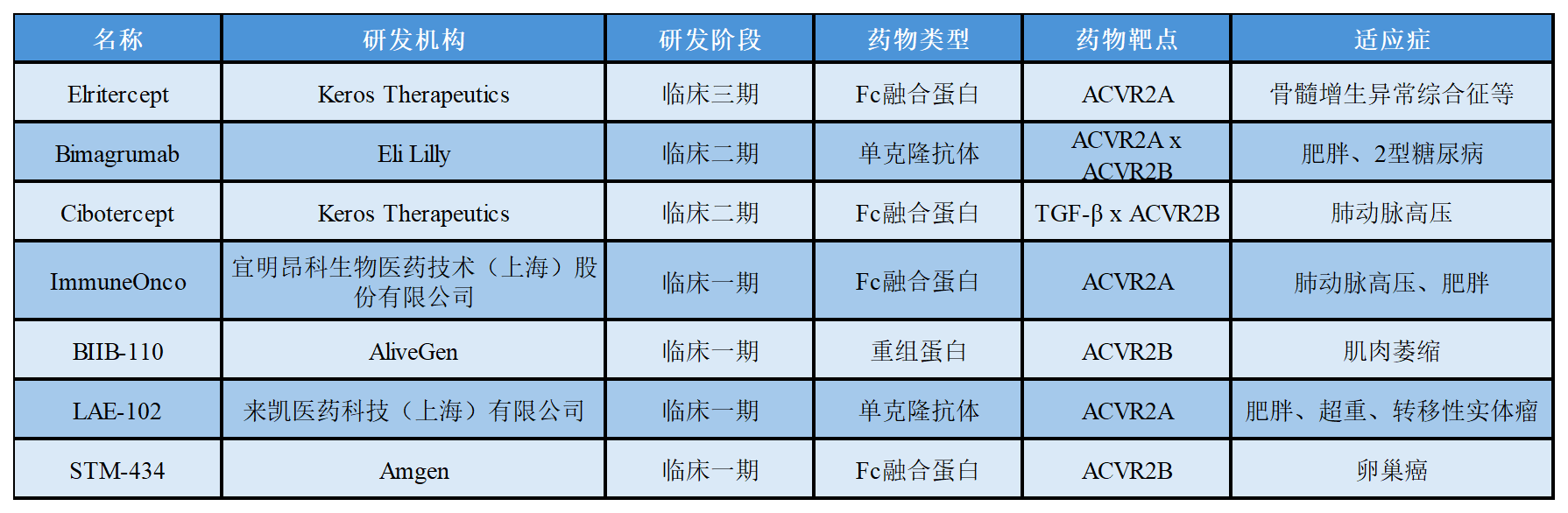 關(guān)于ActRⅡ在研的部分藥物進展如下表所示: