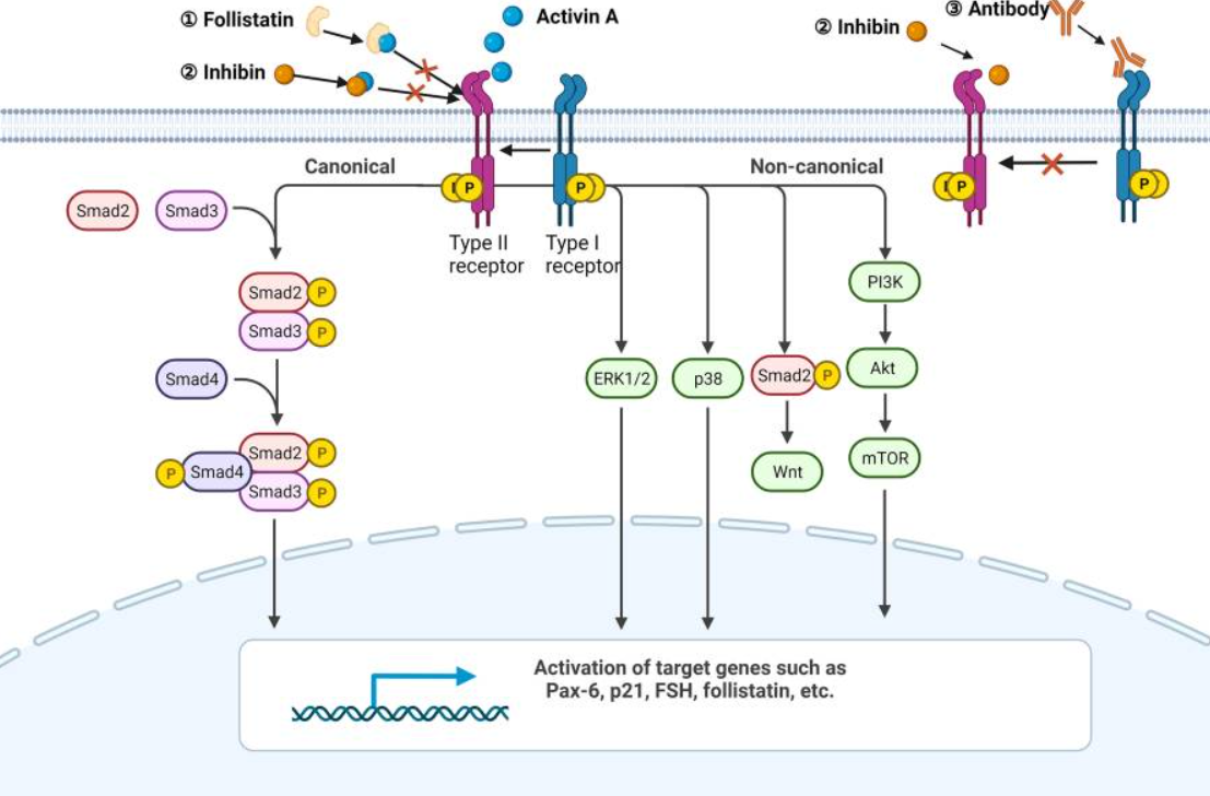 Activin A是一種約25 kDa的細胞因子,可通過二硫鍵與βA和/或 βB 亞基連接形成同源二聚體或異二聚體。Activin A通過兩個I型和兩個II型受體發(fā)出信號,配體結(jié)合后,組裝最終的受體復(fù)合物。I型受體包括激活素受體1A型(或激活素受體樣激酶2,ALK2)、激活素受體1B型(或ALK4)和激活素受體1C型(或ALK7)。II型受體(ActRII)分為激活素受體IIA型(ACVR2A)和激活素受體IIB型(ACVR2B)。