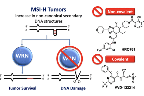 國際頂級期刊之一Nature于去年同一天上線了兩篇關(guān)于WRN(Werner綜合征RecQ解旋酶)抑制劑的文章,其中一篇是關(guān)于Novartis的HRO761的發(fā)現(xiàn)過程,另一篇介紹了拜耳(Bayer)旗下Vividion Therapeutics 公司的VVD-133214 (又叫RO7589831)的發(fā)現(xiàn)過程。這些文章重燃了醫(yī)藥行業(yè)對“WRN”這個(gè)合成致死靶點(diǎn)的關(guān)注。
